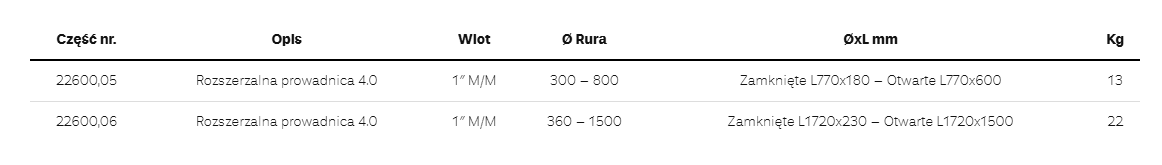 Rozszerzalne prowadnice wykonane z wysokiej jakości stali są dostarczane z sześciokątnym kluczem “T”, który umożliwia szybkie poszerzenie i zwężenie przewodnika. Adaptowalne wyposażenie dla różnych średnic rur.
