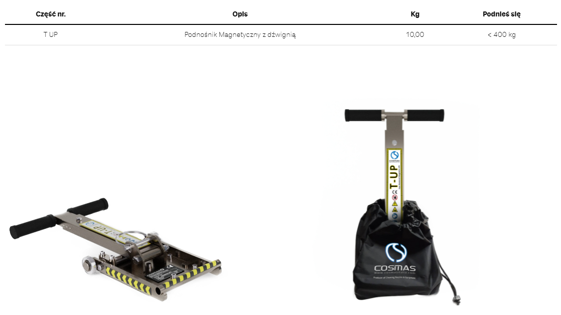 - Podnośnik magnetyczny T-UP jest dostarczany z instrukcją obsługi i certyfikatem C€.